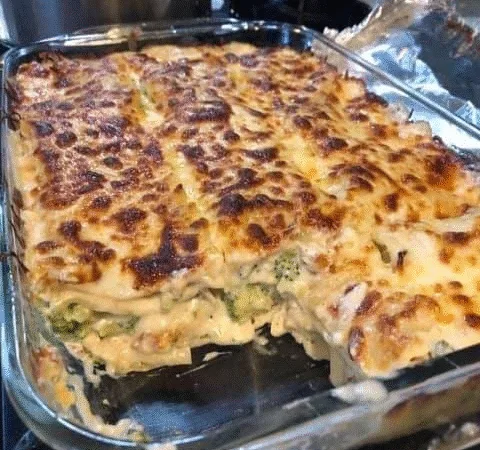 • Add 3 lasagna noodles, then half of the chicken, half of the broccoli, and ⅓ of the sauce.