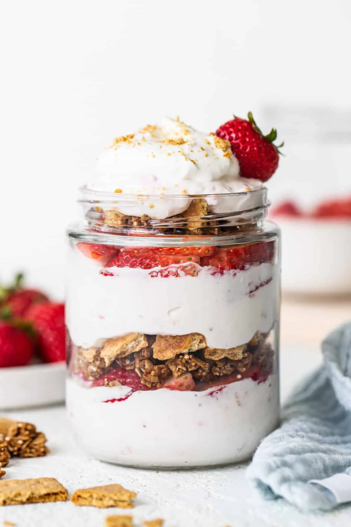 - Layer the cottage cheese mixture, strawberries, granola, and graham crackers in a jar.