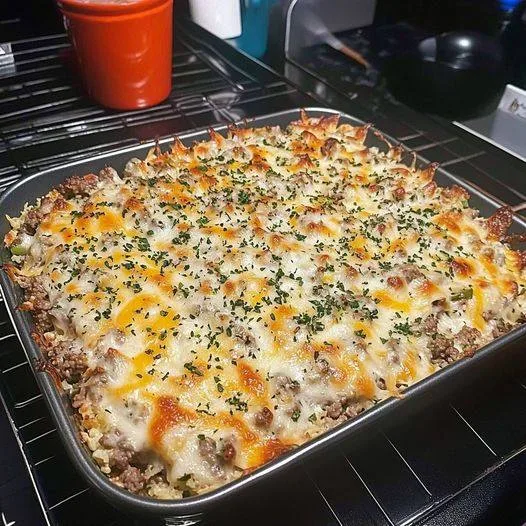 Preheat your oven to 350°F (175°C). In a large casserole dish, spread the cooked cauliflower rice evenly on the bottom. Pour the beef and cheese mixture over the cauliflower rice, spreading it evenly. Top with the remaining cheese, using the Colby Jack, mozzarella, and grated Parmesan.