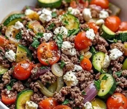 - In a large bowl, combine beef, veggies, and tomatoes
